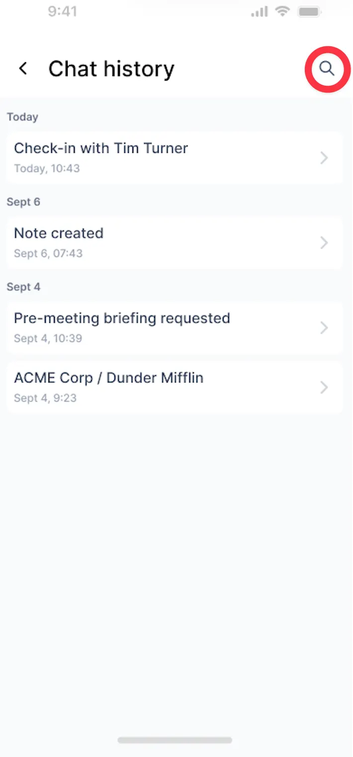 Step 5: From the chat view, tap the clock icon to open a simple chat history overview. Tap the magnifying glass icon to quickly browse through all your conversations.