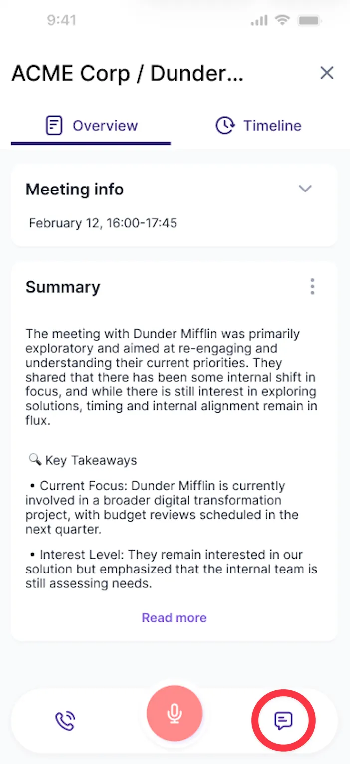 You can easily chat with Donna in the way that suits you best - use the general chat for spontaneous interactions, or switch to meeting-specific chats for more focused and context aware conversations.