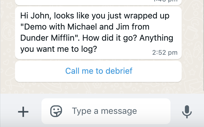 Enable “Post-meeting nudge” notifications in your Personal Preferences and choose to receive them on Whatsapp. Donna will now send messages after your calendar meetings end. Every one of these messages will contain a “Call me to debrief”-button. Once pressed, Donna will call you about this meeting after a few seconds.