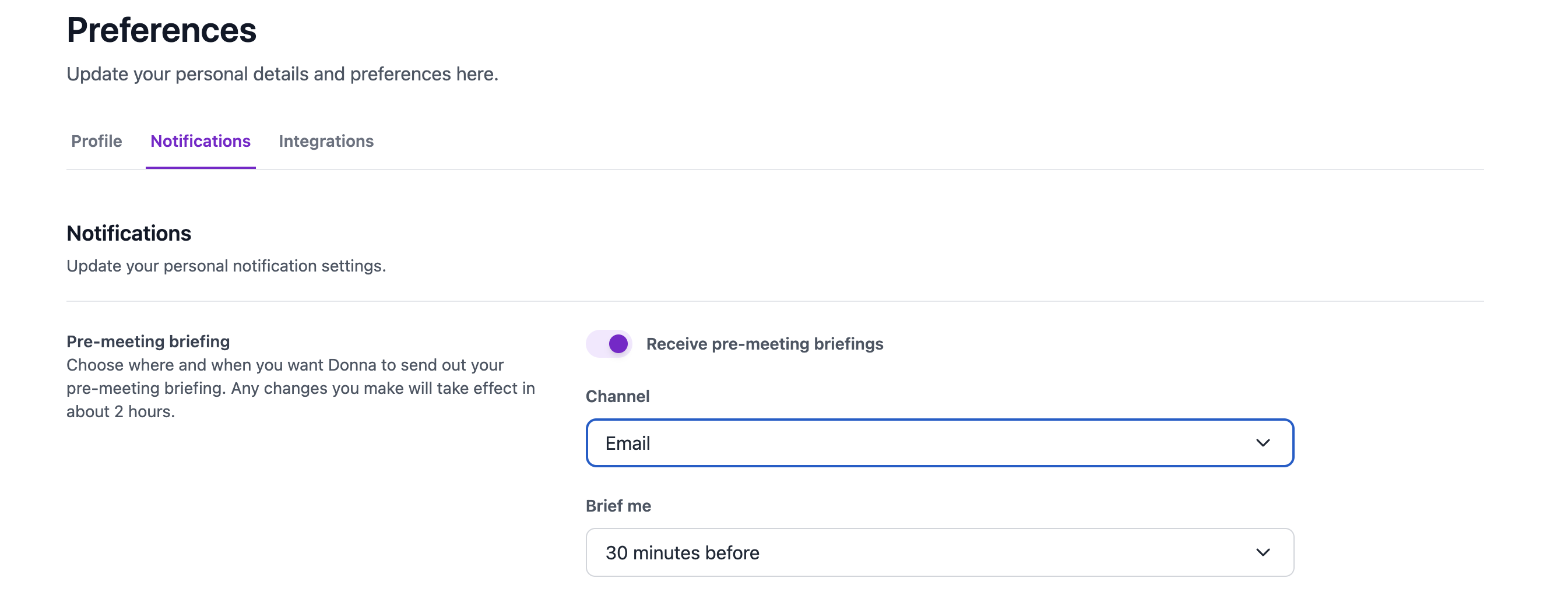 Configure how many minutes before your meeting you want to receive the pre-meeting briefing