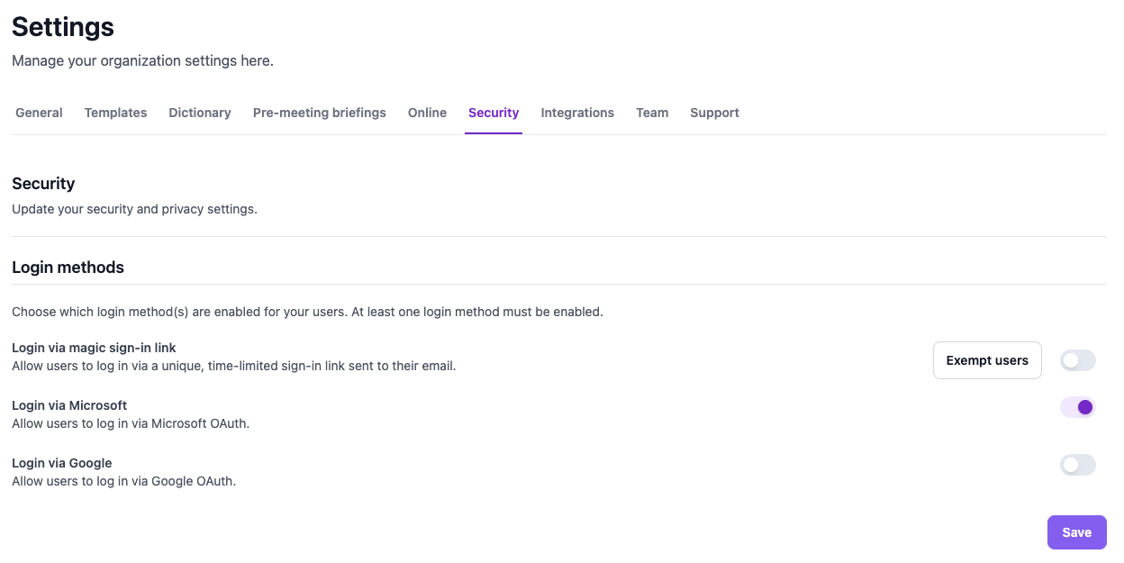 Note that when the magic sign-in login method is enabled, the above setting can be bypassed. The above setting can never be bypassed for users connecting their Outlook calendar. If you want users to be able to only login with their Microsoft account, then disable all other login methods in the security settings of the Donna web app (https://app.askdonna.com/settings/security)