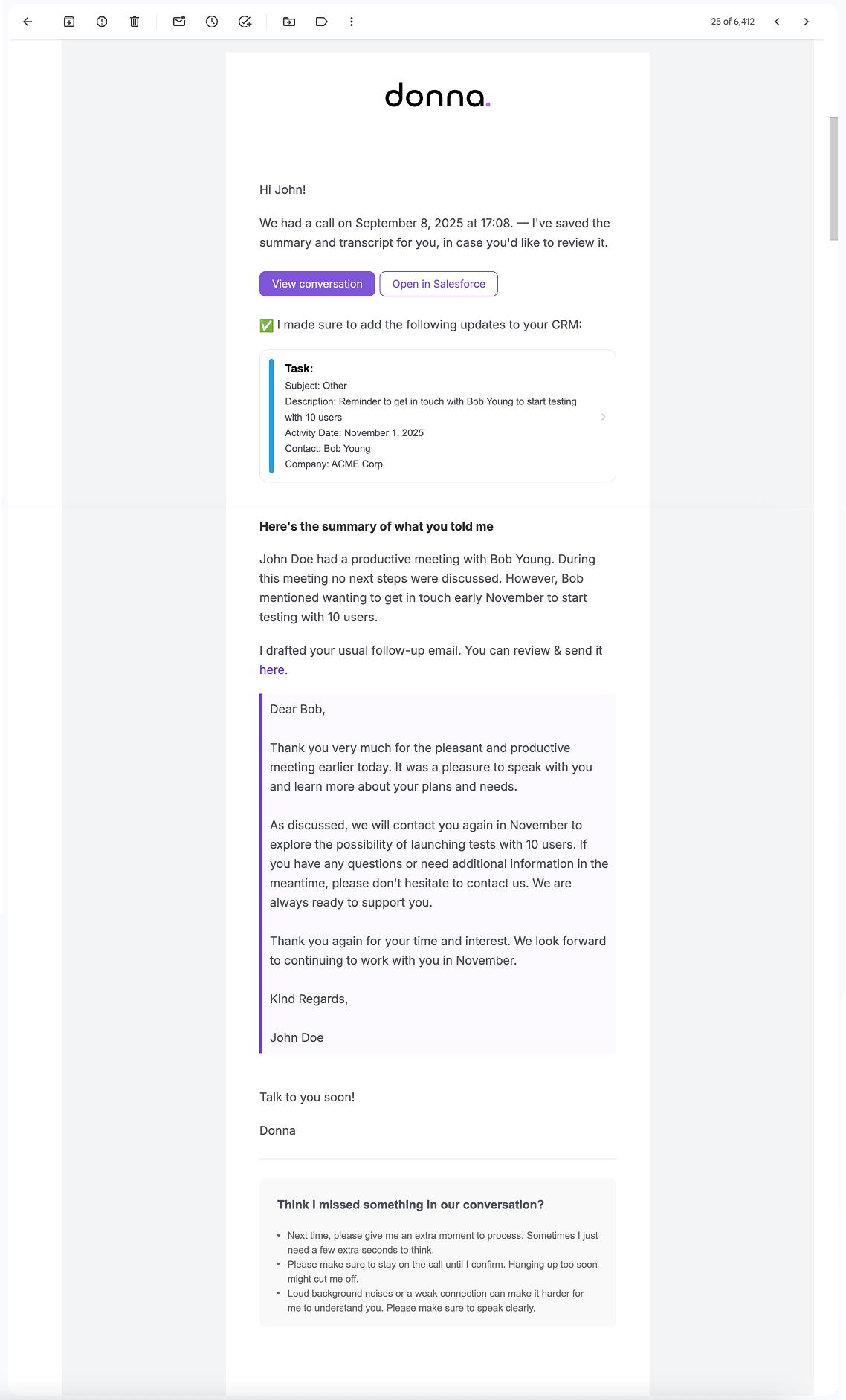 e.g. When meeting a ‘new prospect’, Donna will always create a new contact if she can’t find one in the CRM, note down any info about that prospect and automatically create a follow-up task in your CRM