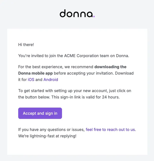 All invited users will receive an email titled “You're invited to join the (company) team on Donna”. After clicking “Accept and sign in”, you’ll be redirected to the Donna web app or, if you’re on a device with the mobile app installed, directly logged into the mobile app.